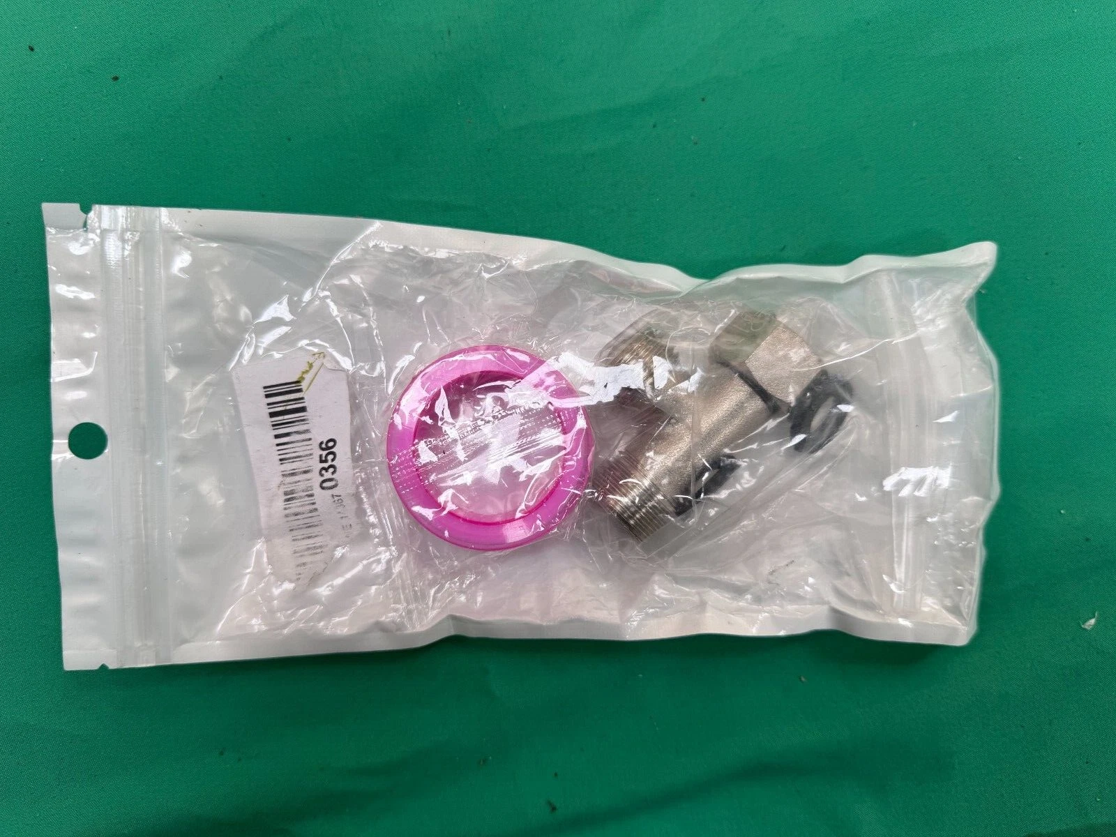 Sealed package containing a brass angle stop valve and a roll of pink Teflon tape.