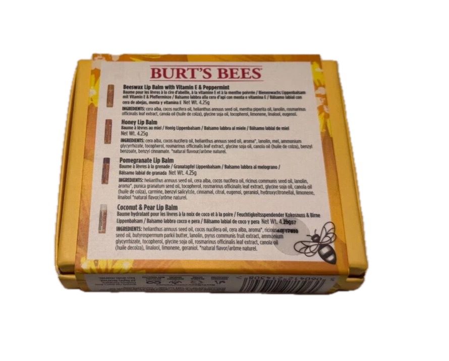 Includes 4 Lip Balms: Beeswax, Honey, Pomegranate, and Coconut & Pear.