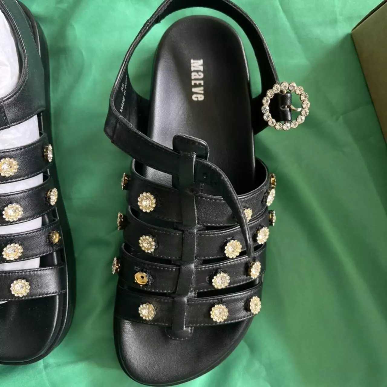 Add a touch of floral elegance to your footwear collection with these stunning Maeve sandals by Anthropologie. Designed in classic black with a bold decorative twist, these sandals feature multiple black faux leather straps adorned with daisy-shaped embellishments and a sparkling rhinestone-studded buckle closure.
